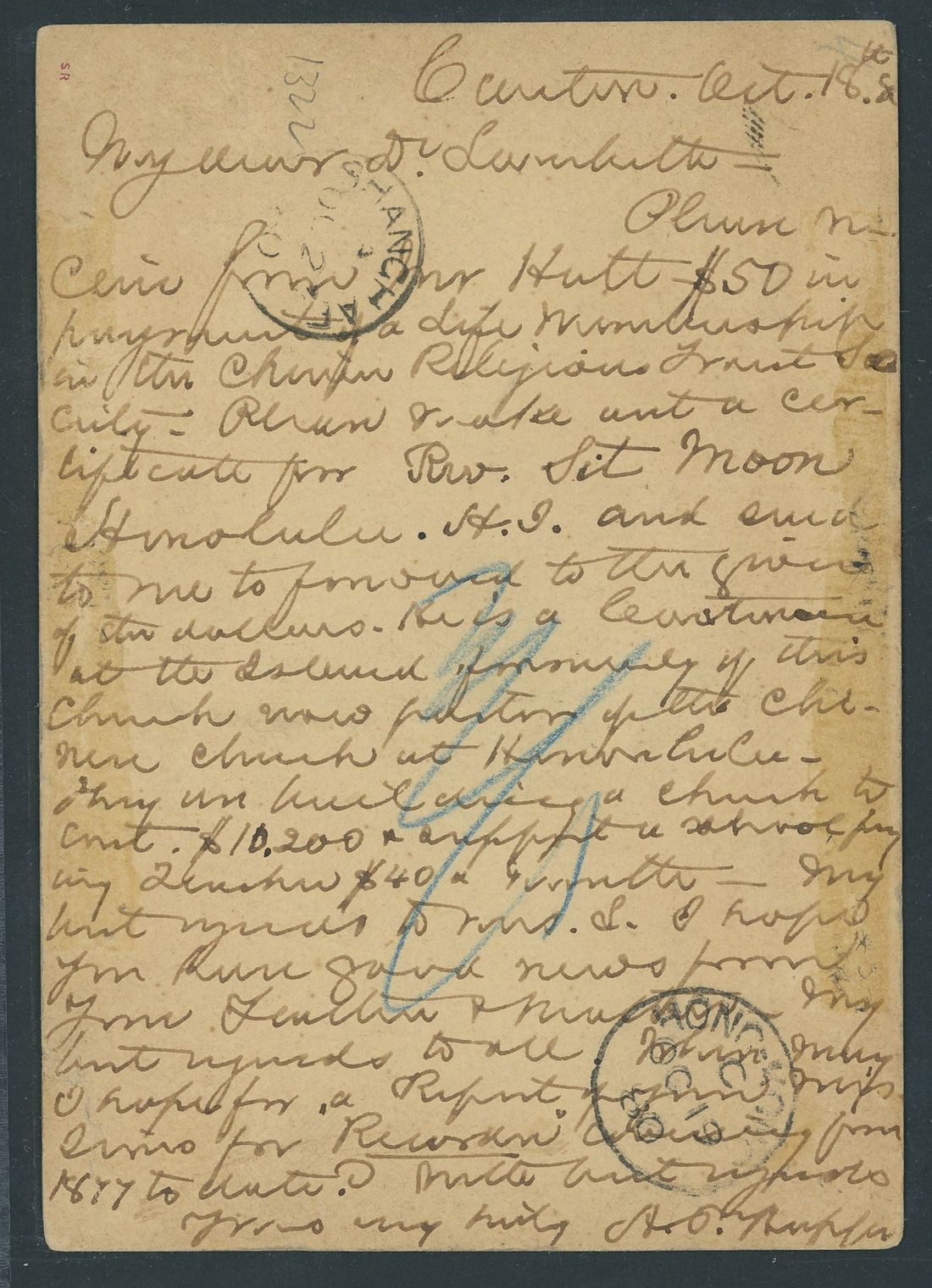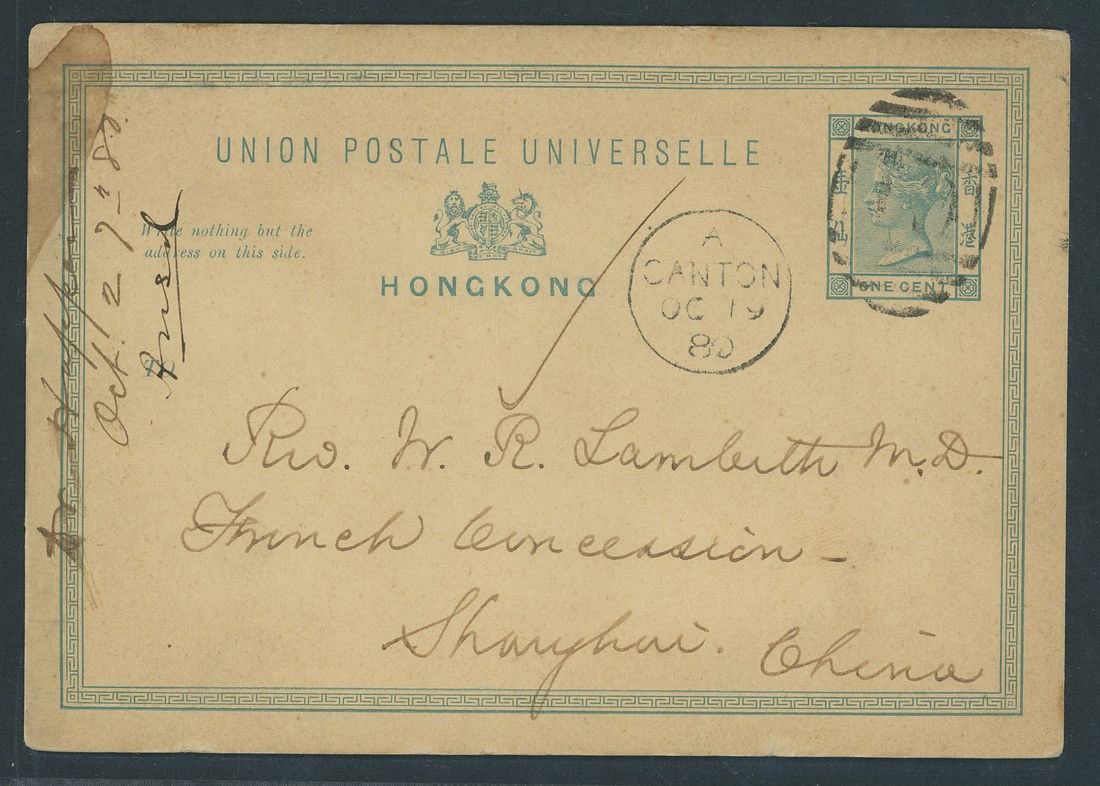 1880 (19 Oct.) Hong Kong 1c. stationery card to Shanghai cancelled by a good strike of "C1" barred oval with type D2 c.d.s. alongside; the reverse bearing Hong Kong (19.10) and Shanghai 27.10) c.d.s.; minor ink stain at left. Photo