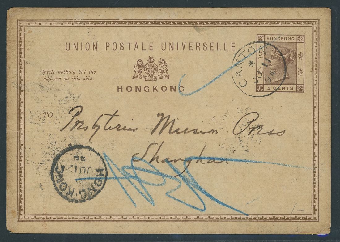 1894 (11 June) Hong Kong 3c. stationery card to Shanghai cancelled by a good strike of the type D4 c.d.s. with code "*" with Hong Kong transit (12.6) and, on the reverse, Shanghai arrival (16.6); light peripheral ageing