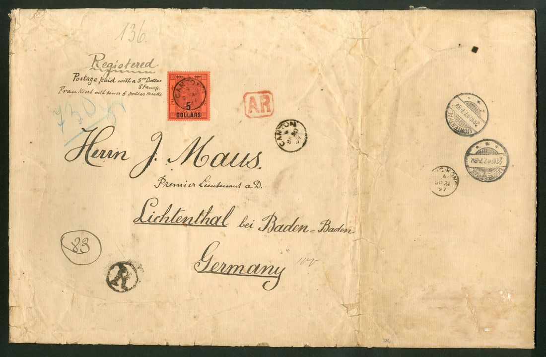 1897 (20 Sept.) very large Maus envelope double registered to Germany bearing Hong Kong Postal Fiscal 1891 $5 on $10 purple on red cancelled by a fine strike of Canton code "*" c.d.s. with a second strike alongside, a superb strike of the boxed "AR" struck in red (the earliest date recorded by Proud) and large "R" in circle; with Hong Kong (21.9) and Lichtenthal (23.10) c.d.s. There is a heavy vertical crease at right where the envelope was originally folded over for posting. Some expected ageing but a very rare use of the surcharge stamp. Photo