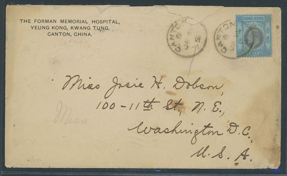 1905 (13 Jan.) envelope from the Forman Memorial Hospital to U.S.A. bearing K.E.VII 10c. purple and blue on blue tied by type D8 c.d.s. code "B" with single digit "5" for the year with a second strike alongside, the reverse bearing Hong Kong (14.1), Washington arrival (24.2); some edge faults. Photo