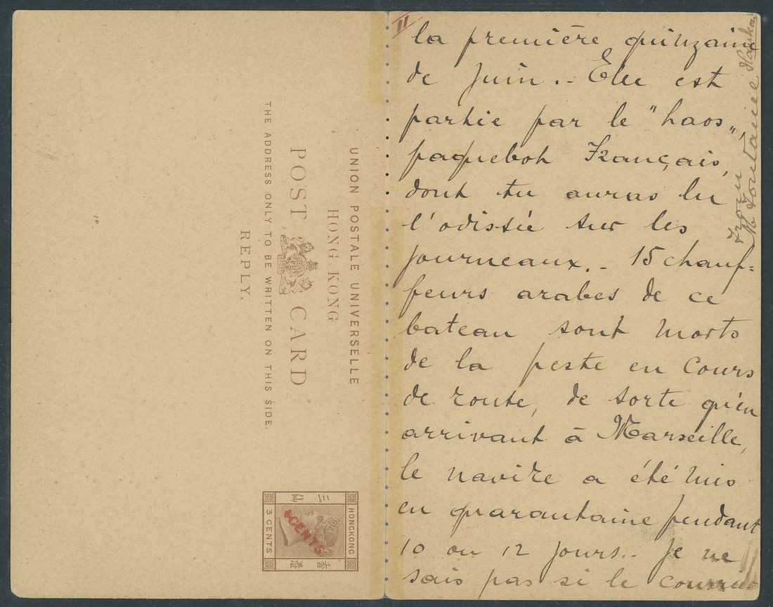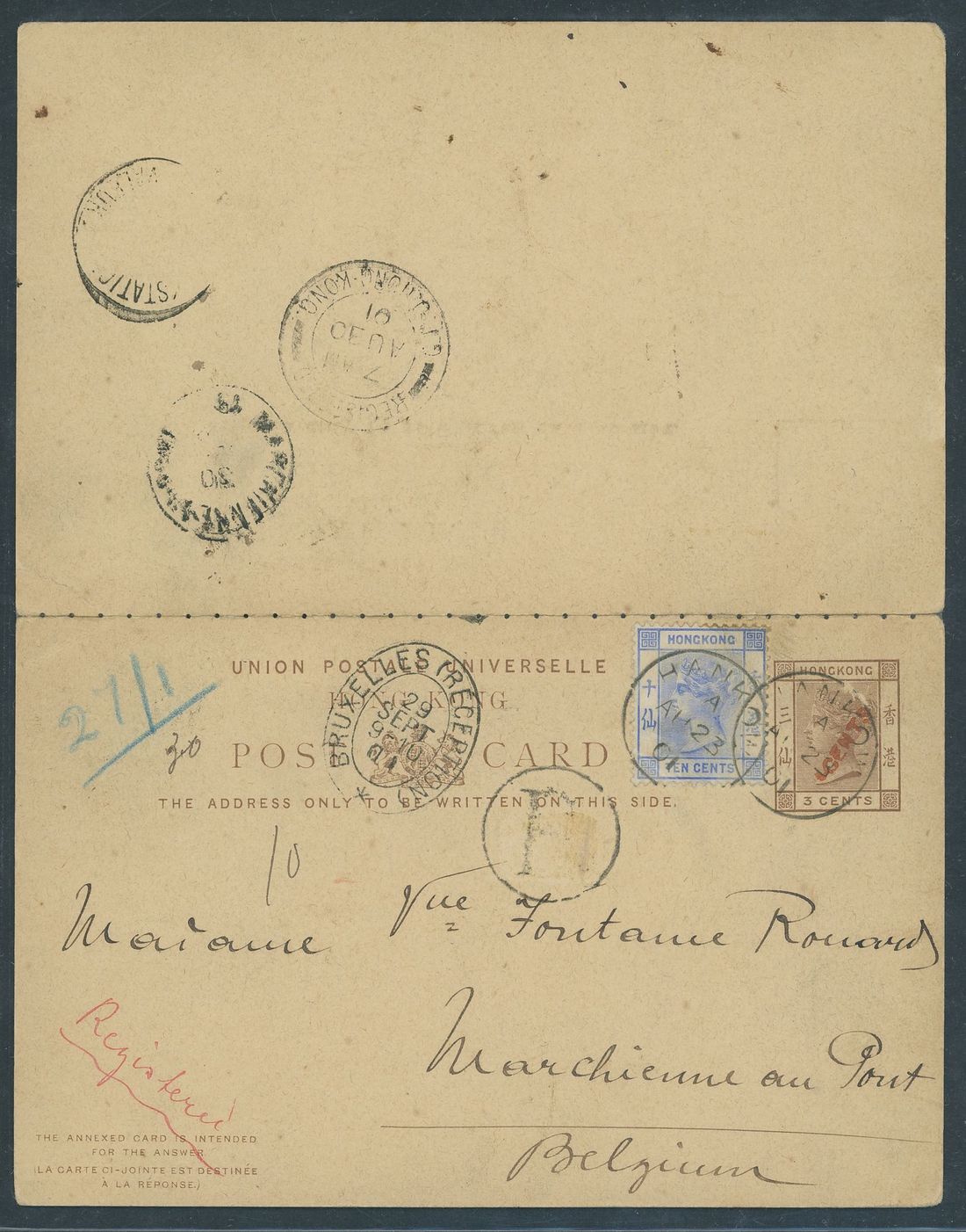 1901 (23 Aug.) 4c. on 3c. complete reply card (reinforced along centre fold) registered to Belgium, uprated 10c. blue cancelled by Hankow type Ji code "A" c.d.s. with large "R" in circle alongside with Brussels registered arrival oval (29.9); the reverse with Registered Hong Kong c.d.s. (30.8) and two other c.d.s. including arrival (30.9). A very scarce complete reply card sent by registered mail. Photo