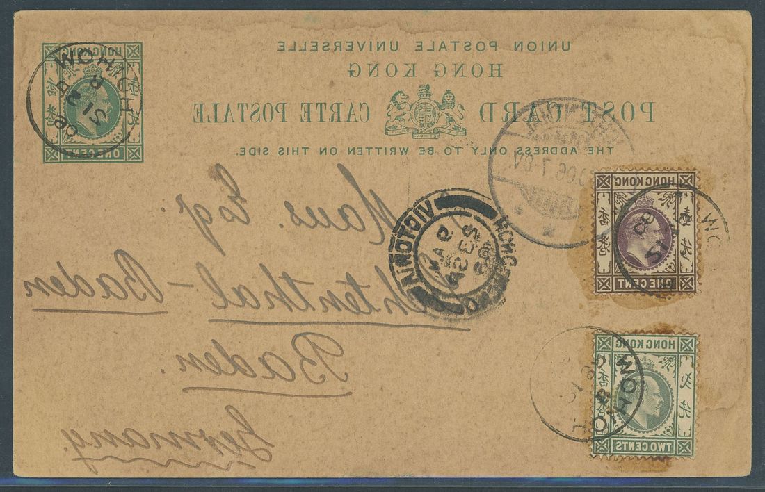 1906 (21 Sept.) Hong Kong K.E.VII 1c. green stationery card to Germany, uprated with 1c. and 2c. tied by good strikes of type D8 c.d.s. code "B" with Victoria, Hong Kong transit (23.9) and Lichtenthal arrival; slight staining at top and light corner bend. Photo