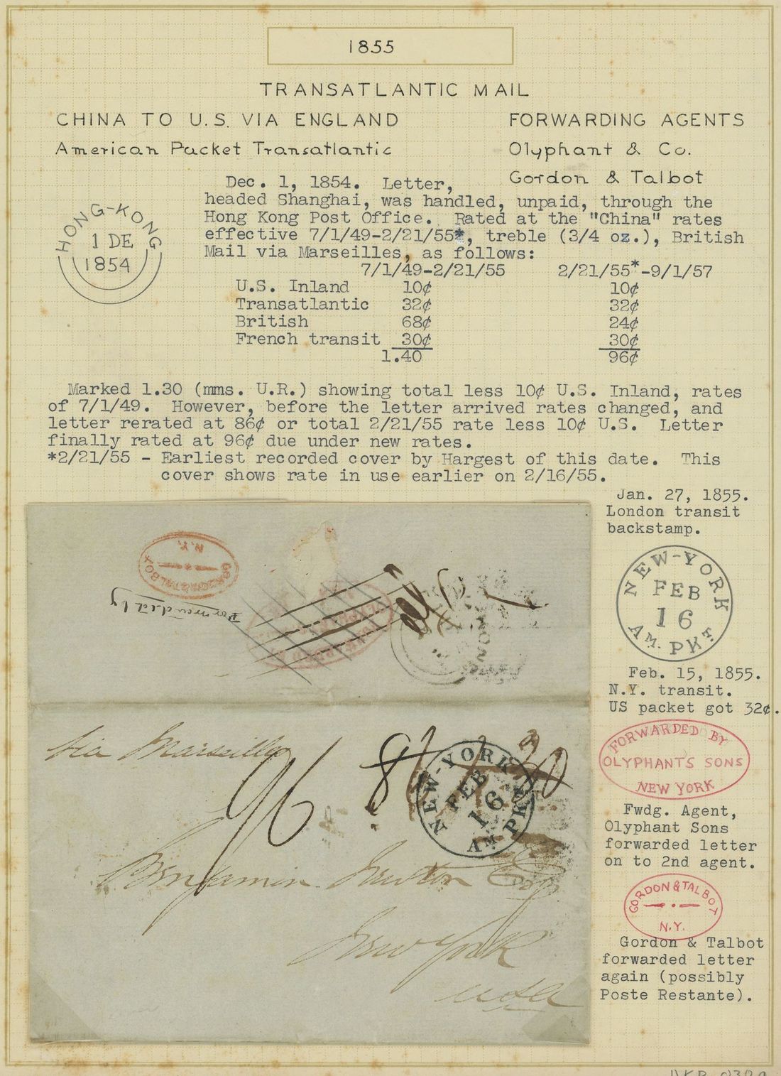1854 (2 Dec.) entire letter to New York "Via Marseilles" bearing rate marks of "1.30" and "86" crossed through and finally "96", with Hong Kong c.d.s. (11.2) on the flap along with oval "