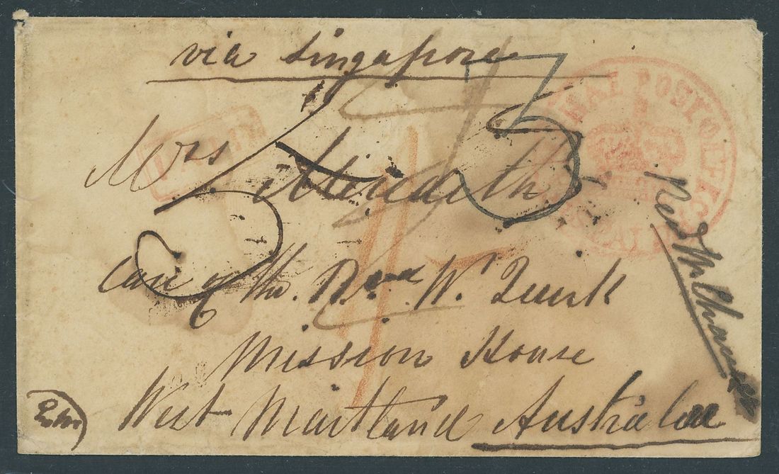 1856 (July) envelope to West Mailtand (N.S.W.) "via Singapore", a good strike of the "