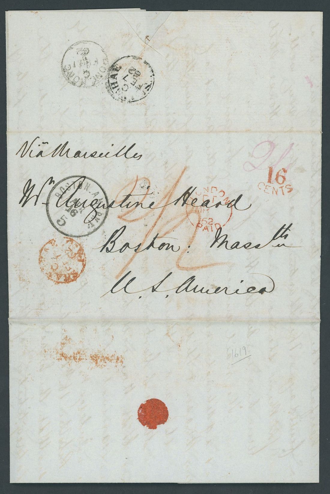 1862 (7 Feb.) Augustine Heard entire to Boston "Via Marseilles" bearing a fair strike of the serif letters "