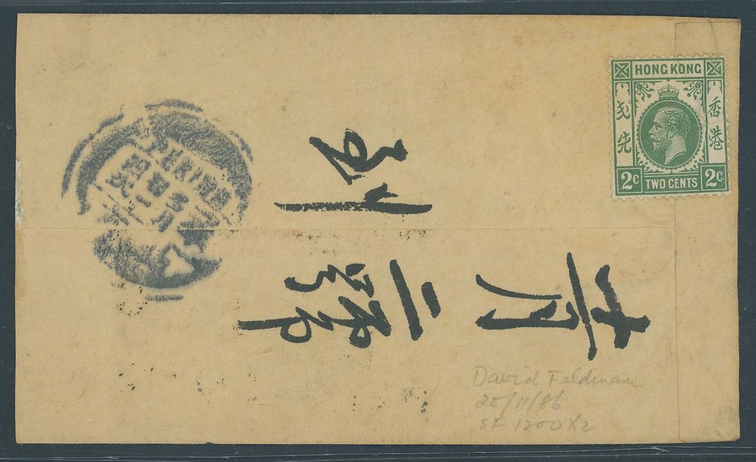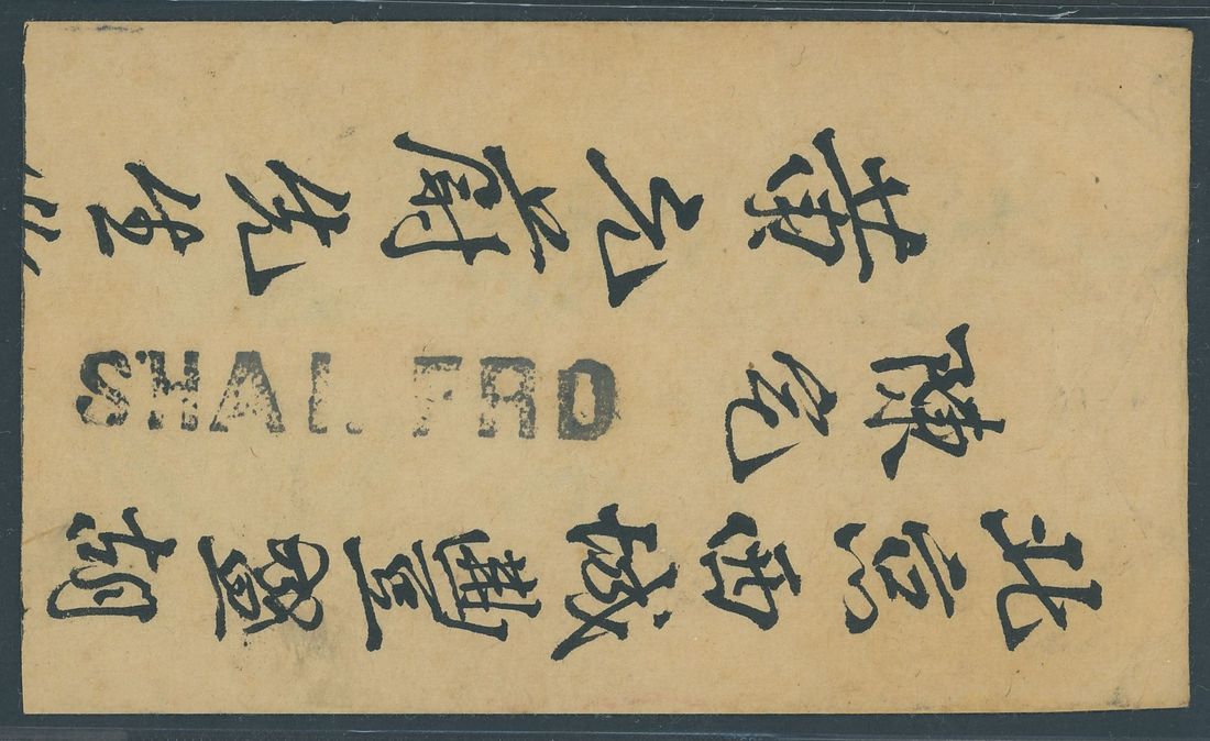 1914 (c.) small native envelope from Hong Kong to Peking bearing (on the reverse) uncancelled Hong Kong K.G.V 2c. green, the address side (slightly reduced) bears a fine strike of the "SHAI. FRD" straight-line handstamp in black, the reverse bearing a smudged strike of Peking English/Chinese c.d.s. A fine example of this unusual postmark, it is thought that only two have been recorded. Photo