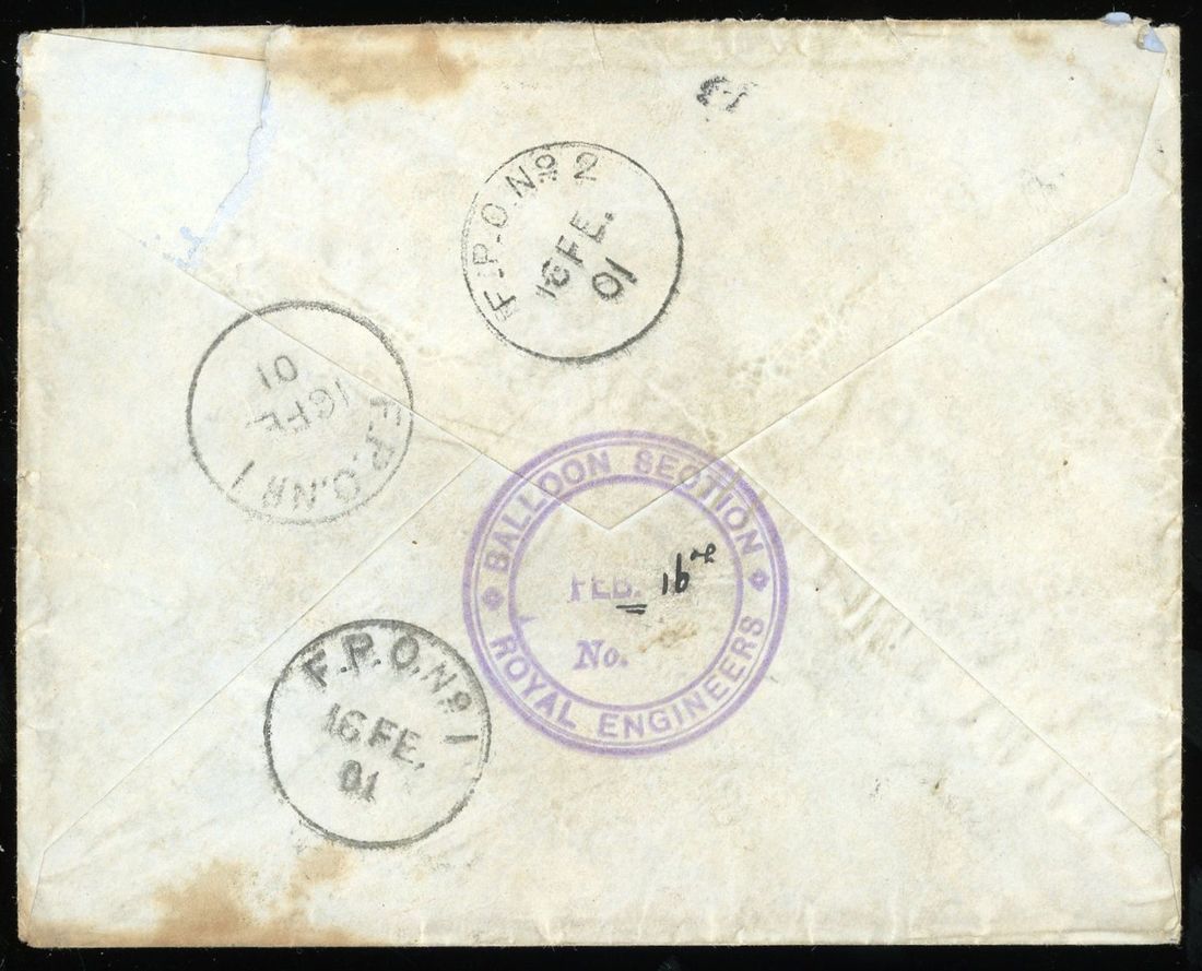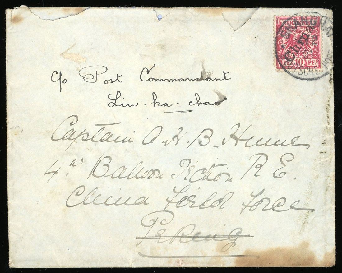 1901 (4 Feb.) envelope addressed to Captain A.H.B. Hume, 4th Balloon Section R.E., China Field Force, Peking bearing German Post Office 10pf. tied by "