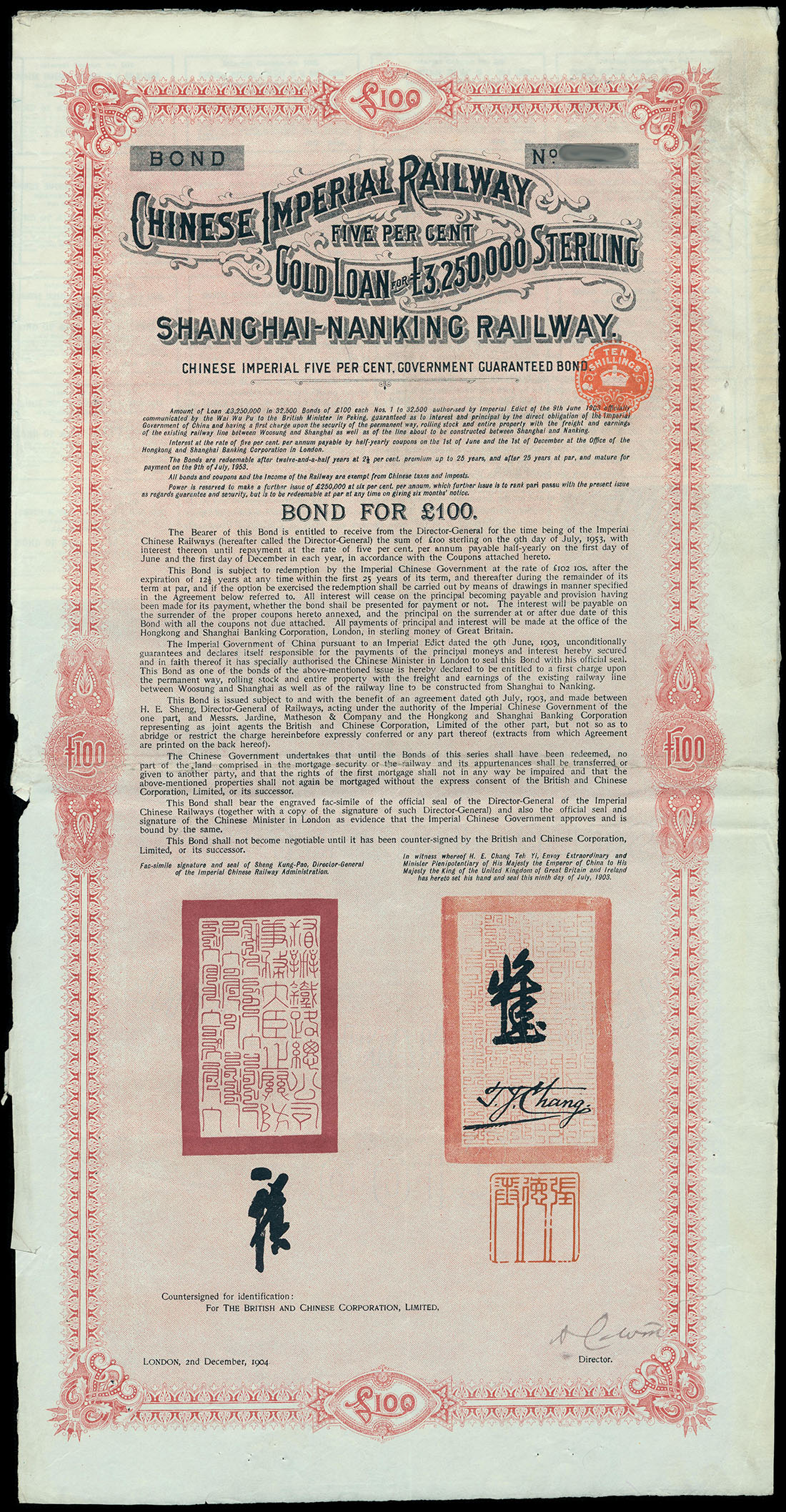1904 Shanghai-Nanking Railway 5 % Gold Loan, group of 19 bonds, large format with ornate border, red and black, with coupons,