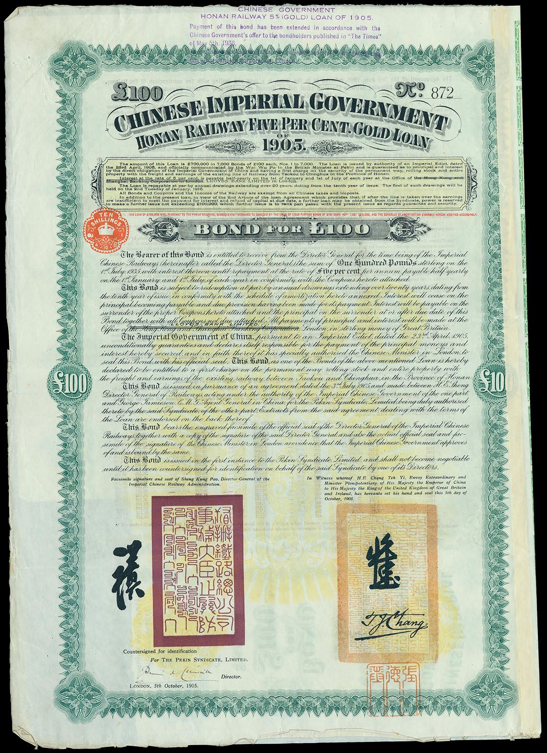 1905 Chinese Imperial Government Honan Railway 5% Loan, bond for 100pounds, no. 872, large format piece, green and yellow with black English text and coupons, only 7000printed at the time,