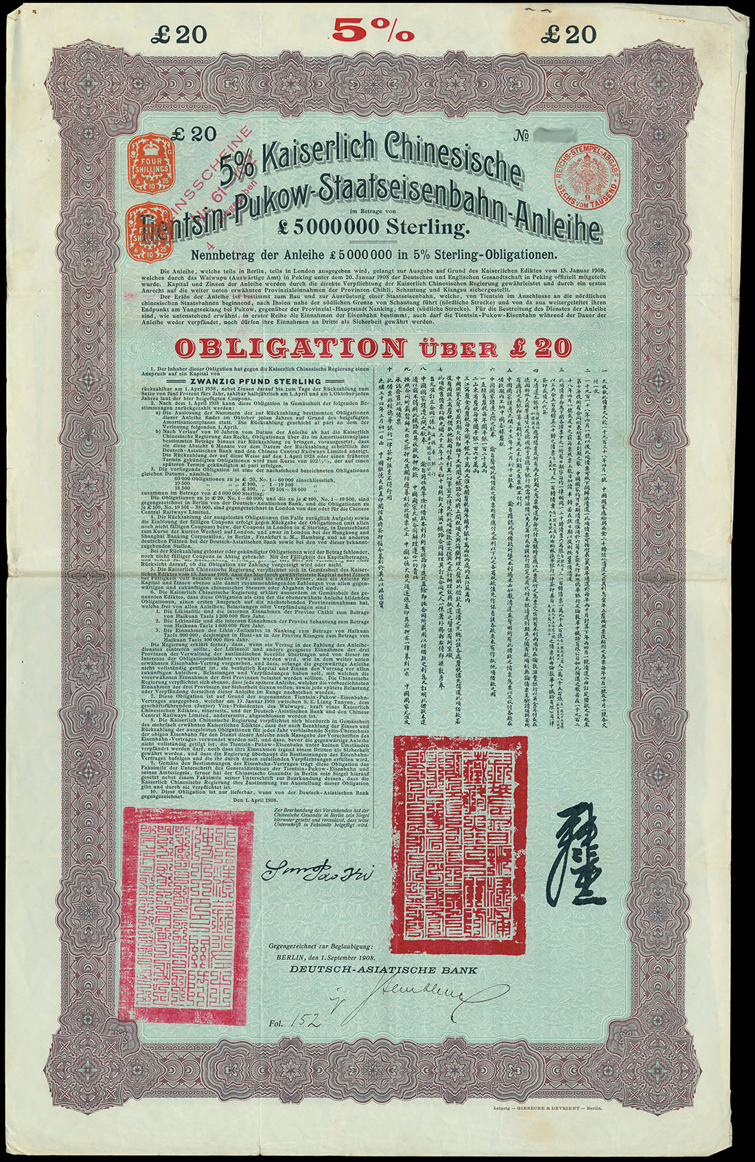 1908 5% Tientsin-Pukow Railway Loan, group of 12 bonds for 20pounds, issued by Deutsch-Asiatische Bank, large format with ornate border, purple, pale blue underprint, text in German and Chinese, red chops below, with coupons,