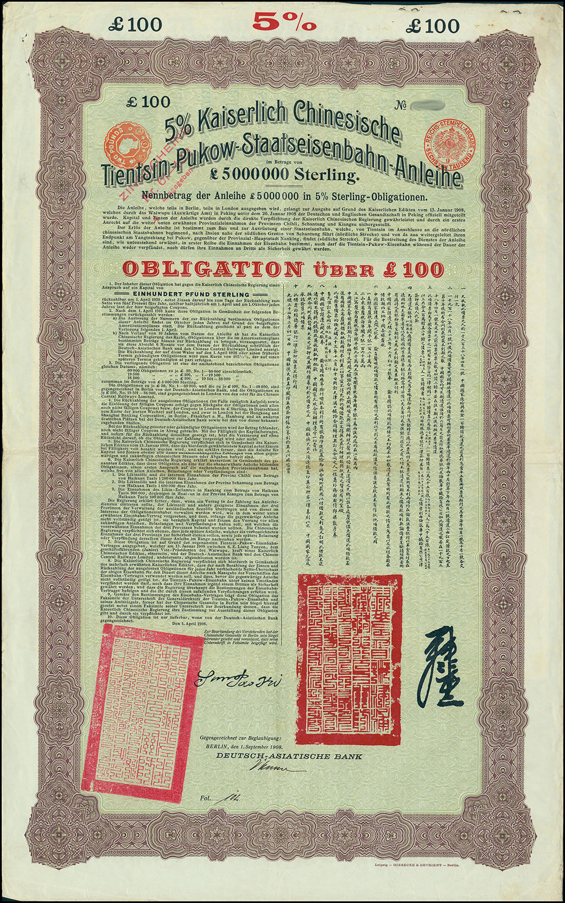 1908 5% Tientsin-Pukow Railway Loan, group of 16 bonds for 100pounds, issued by Deutsch-Asiatische Bank , large format with ornate border, purple, pale green underprint, text in German and Chinese, red chops below, with coupons,