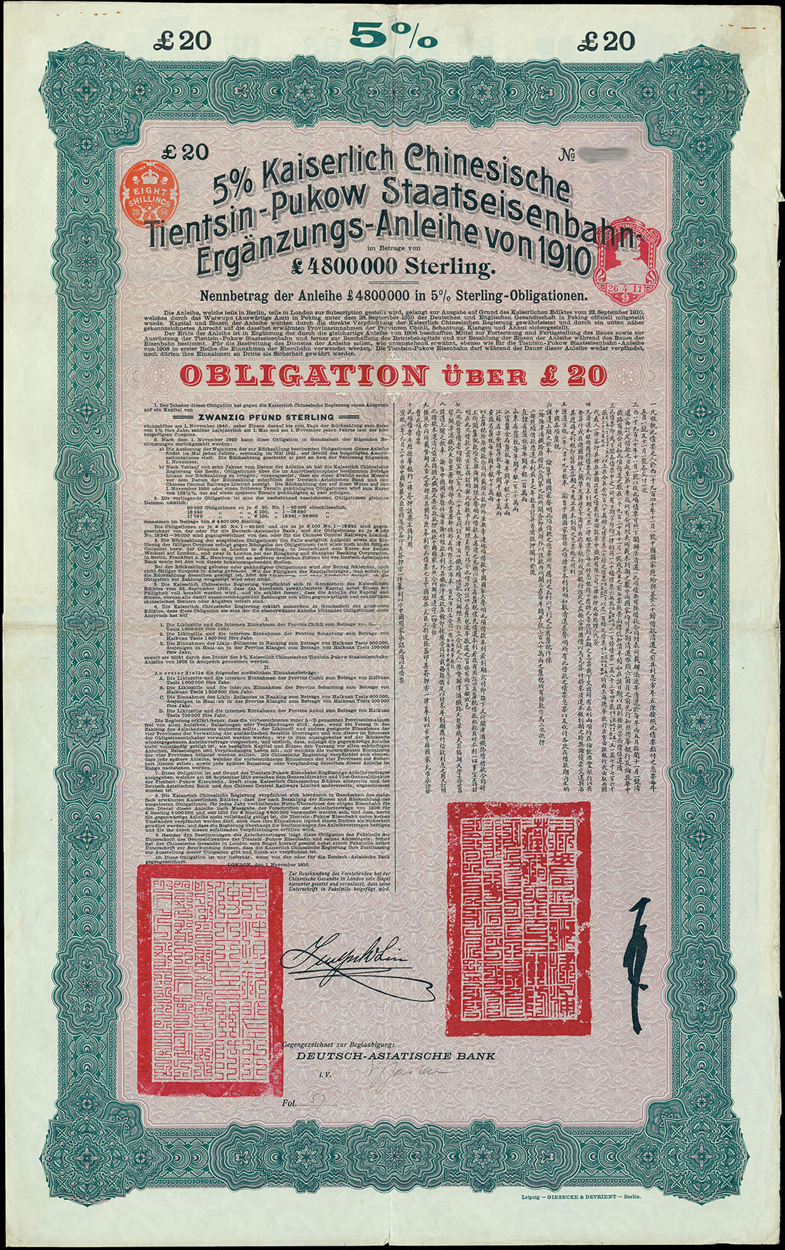 1910 5% Tientsin-Pukow Railway Loan, group of 12 bonds for 20pounds, large format with ornate green border, pale purple underprint and purple, text in German and Chinese, red chops below, with coupons