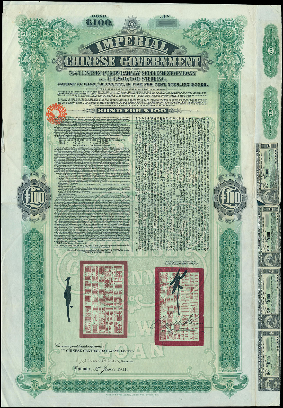 1911 5% Imperial Chinese Government Tientsin Pukow Railway Supplementary Loan, group of 2bonds for 100pounds, issued by the Chinese Central Railways Limited, large format piece, green and black with Chinese and English text, two large red Chinese seals at bottom,