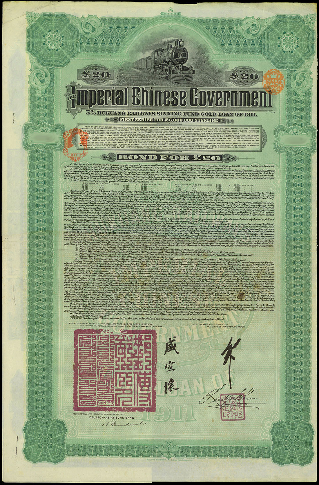 1911 Imperial Chinese Government, 5% Hukuang Railways Gold Loan, group of 6 bonds for 20pounds, issued by Deutsch-Asiatische Bank, large format with vignette of steam train at top, ornate border, green and black, printed by Waterlow & Sons, with coupons, print run of 30,000