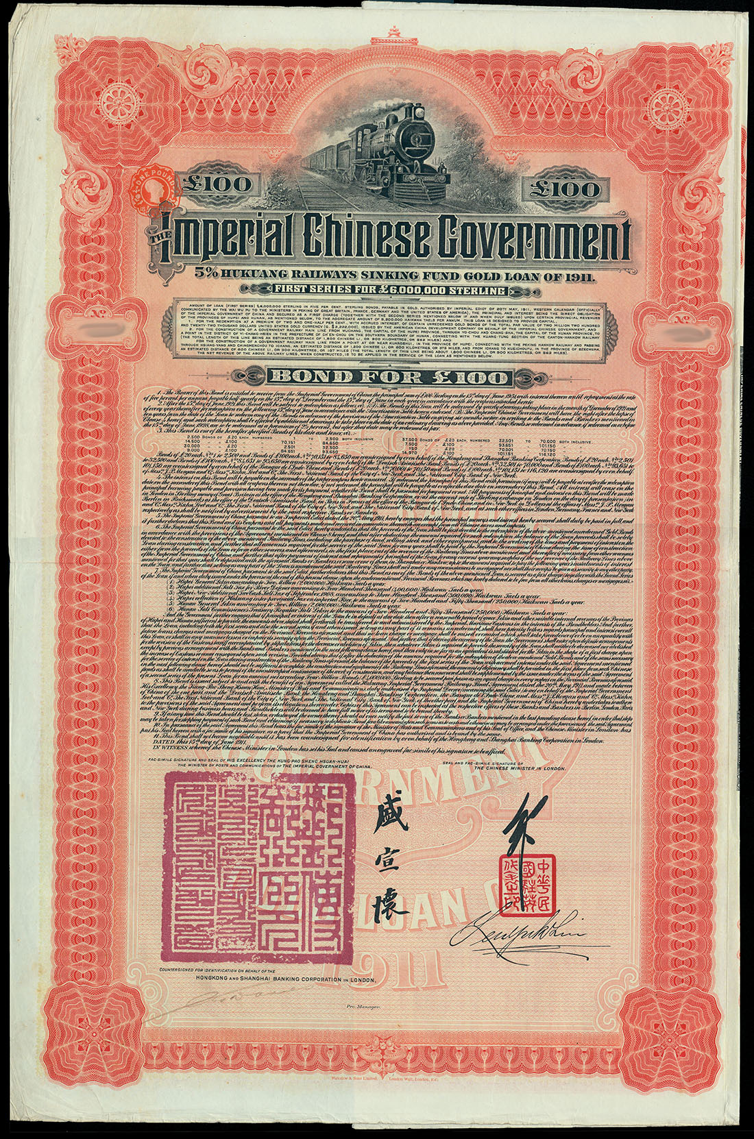 1911 Imperial Chinese Government, 5% Hukuang Railways Gold Loan, group of 3 bonds for 100pounds, issued by HSBC, large format with vignette of steam train at top, ornate border, red and black, printed by Waterlow & Sons, with coupons, print run of 14,500