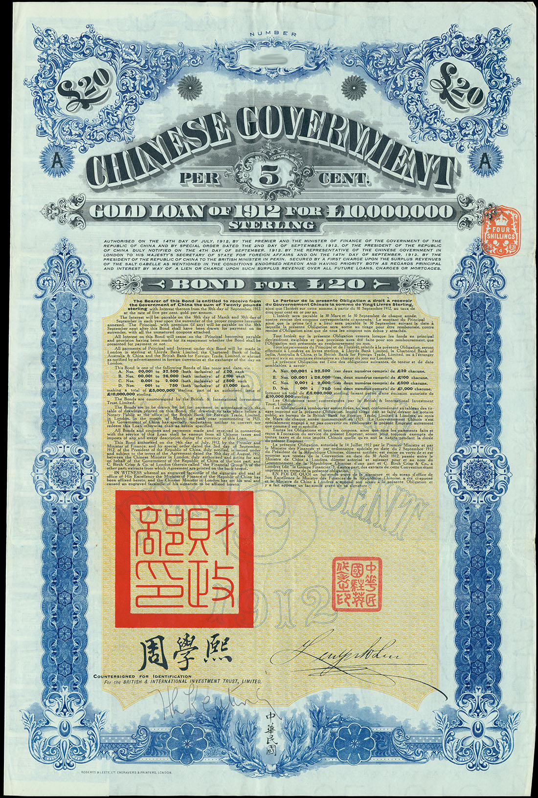 1912 The Chinese Government 5% 'Crisp' Gold Loan, group of 5 bonds for 20pounds large format, blue on yellow underprint, black text and red seal signatures, signed by Zhou Xue Xi,