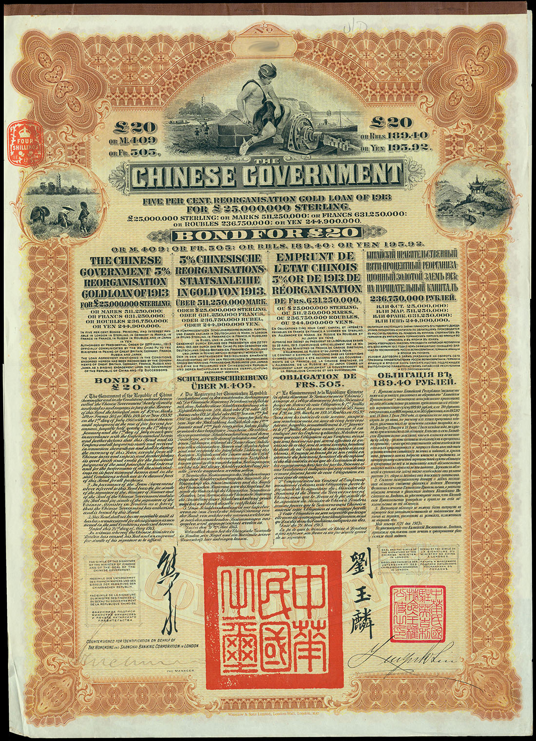 1913 5% The Chinese Government Reorganisation Gold Loan, group of 3 bonds for 20pounds, issued by HSBC, brown and black, 'Mercury' at top, rice planting at left and pagoda at right, printed by Waterlow and Sons,