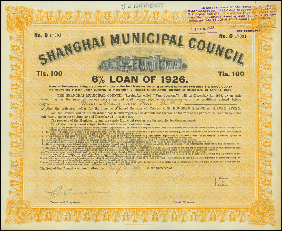 Shanghai Municipal Council, 6% Loan of 1926, 100taels, serial number D17391, orange and black, neo-classical buildings top centre, handsigned signatures bottom left and right, about very fine, pinholes top left and a couple of small tears top border