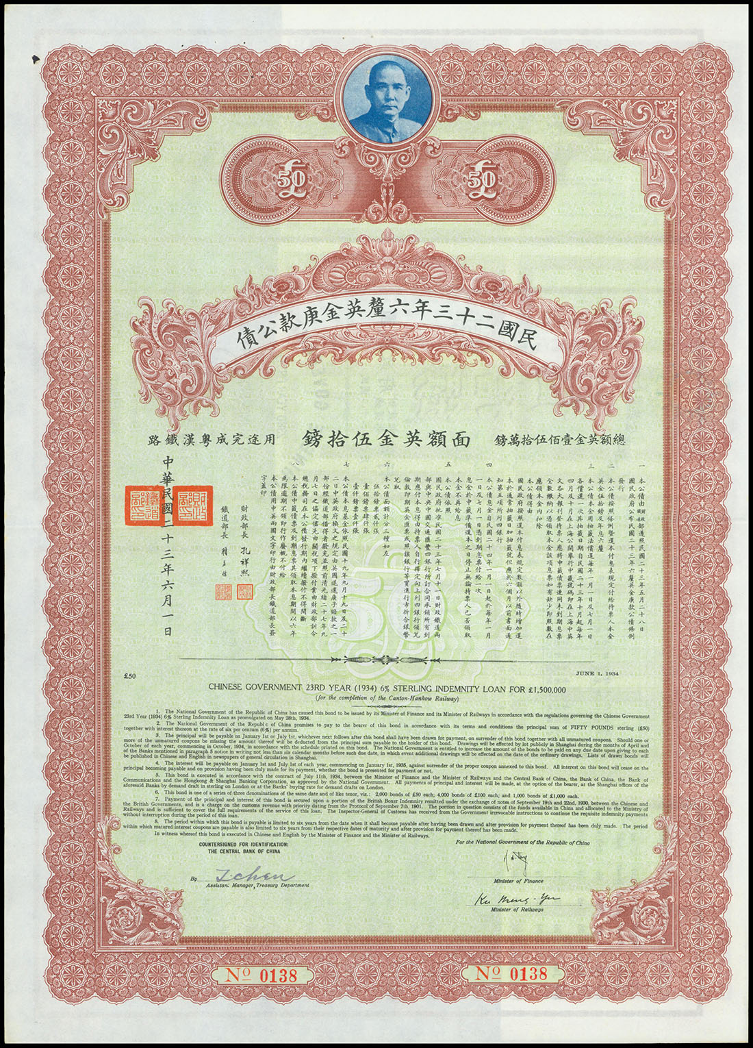 1934 6% Sterling Indemnity (Boxer Loan), bond for 50pounds, red serial number 0138, ornate border with vignette of Sun Yat Sen at top, blue, brown and black on green underprint, with coupons,