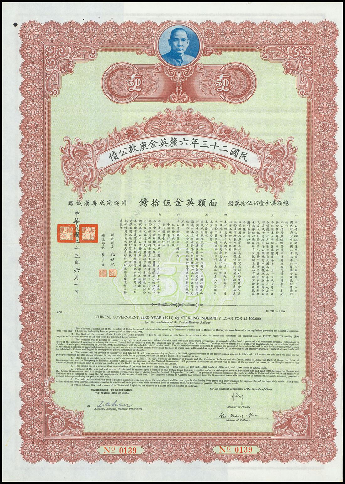 1934 6% Sterling Indemnity (Boxer Loan), bond for 50pounds, red serial number 0139, ornate border with vignette of Sun Yat Sen at top, blue, brown and black on green underprint, with coupons,