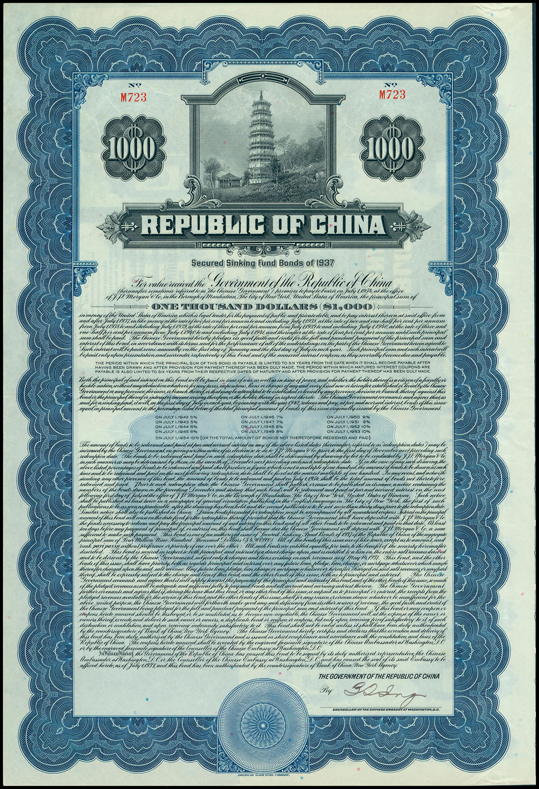 1937 Republic of China Secured Sinking Fund Bond, bond for $1000, no. M723, blue and black, pagoda at top, English text,