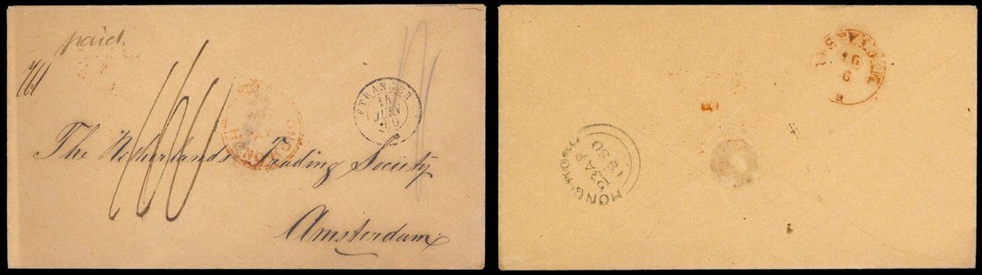 1850 (23 Apr.) stampless envelope to Amsterdam (16.6) via Etranger (14.6), on reverse tied by "Hong Kong" double-arch d.s. (Webb type 9); and on front tied by "Paid At Hong Kong" medium-crowned c.d.s. (Webb type 8), very fine. Photo
