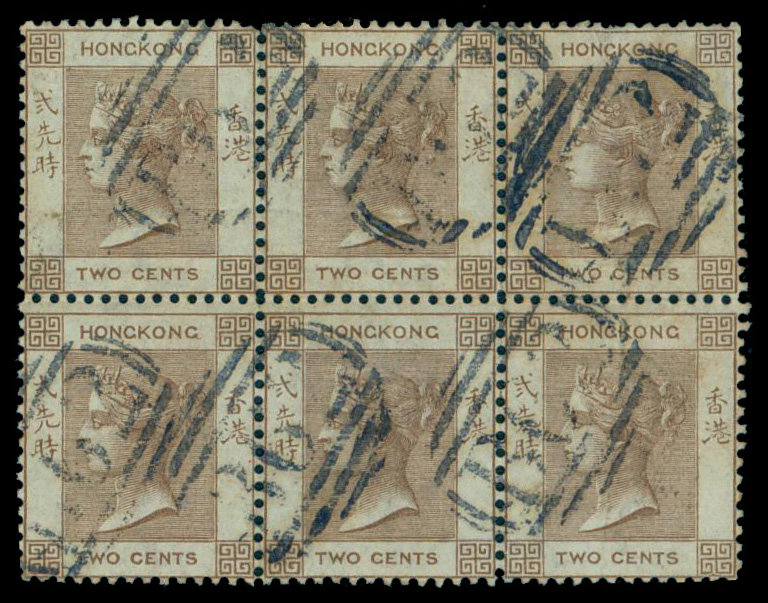 Revised description: 1863 watermarked 2c. brown block of six (3x2), very fine cancelled by "B62" obliterator, rarely appeared on large multiple. Yang 8. Photo