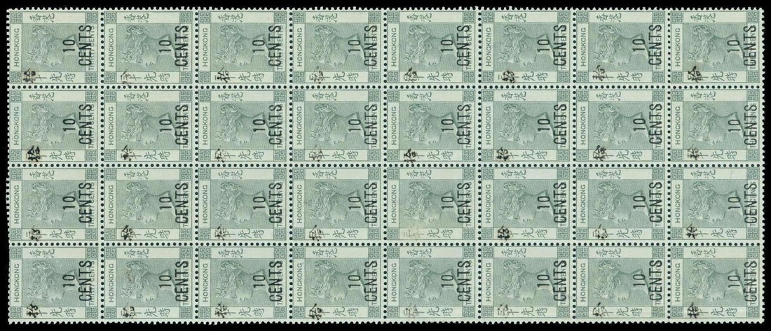 1898 10c. on 30c grey-green with Chinese character, a block of thirty two [2-6] of the first printing, unmounted mint; shows changing strengths of the Chinese handstamp (one faint one has been partly scratched out. A particularly fresh and fine block. S.G. 55. Photo