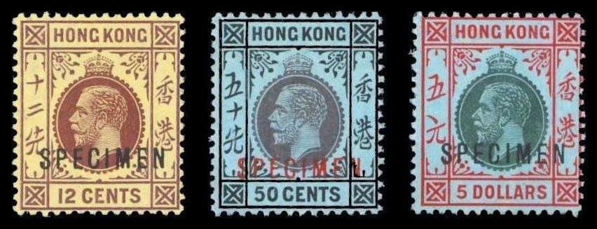 12c., 50c. and $5 in white back, overprinted "specimen", large part original gum. S.G. 106a, 111a, 115a S, £700. Photo