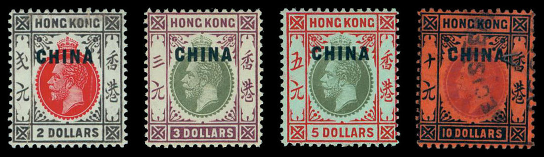 1917-21 "China" overprint watermark multiple crown CA 1c. to $10 set of sixteen; the key value $3 and $5 unmounted (toned gum); 1c., 6c., 8c., 12c., 25c., 30c.and $2 unused with hinge remnants (7); 2c., 4c., 10c., 20c., 50c., $1 and $10 used (7), Yang BP1-BP16. Photo
