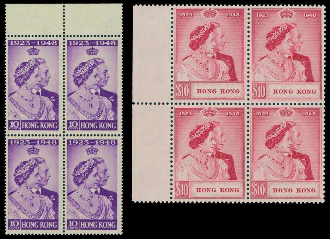 1948 Royal Silver Wedding 10c. and $10 set of two in marginal blocks of four, unmounted mint, very fine. Photo