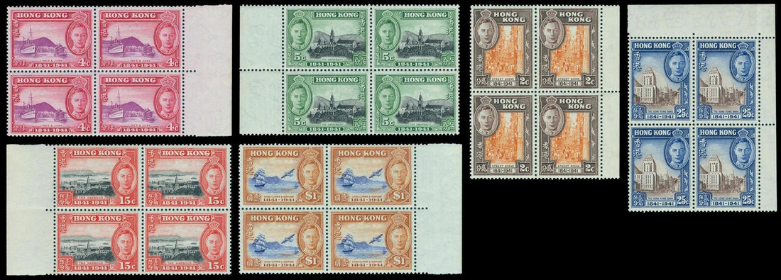 A group of commemorative issues in blocks of four with 1941 Centenary set of six and 1949 U.P.U., unmounted mint; all are with margins, U.P.U. set with corner margins showing the sheet numbers. Fine. (48). Photo