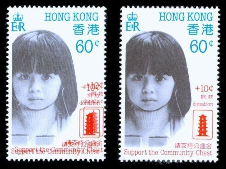 1988 Support for Community Chest Charity 60c.+10c., variety red double print, with normal stamp for comparison. Photo