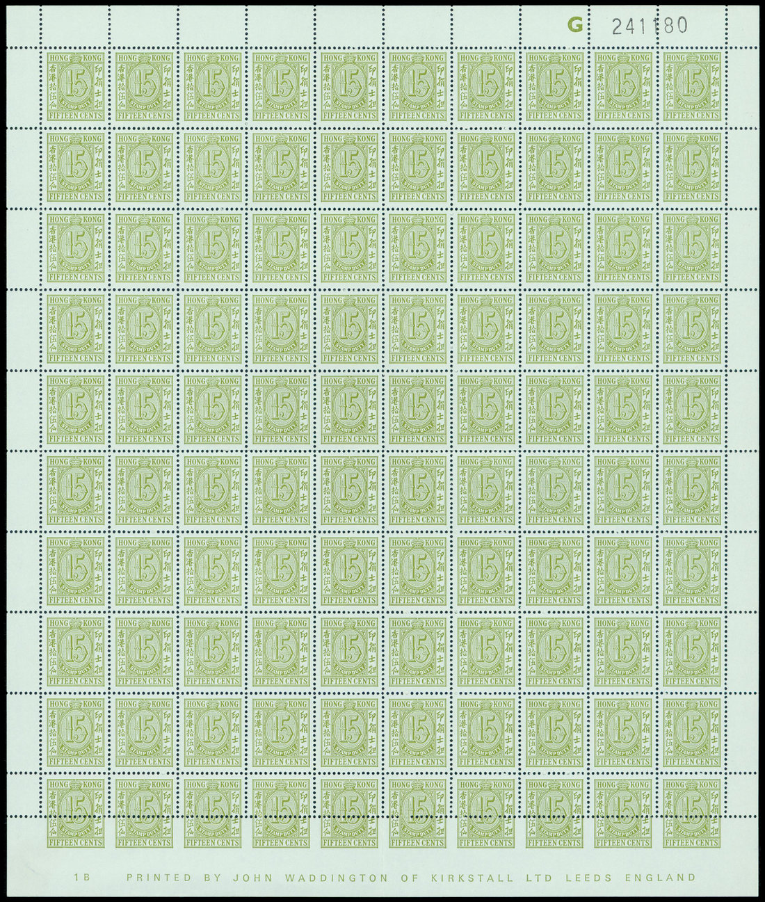 1938 Stamp Duty 15c. green complete sheet of 100 (10x 10), with selvedge all around, unmounted mint, the last row showing misperf. variety, very fine and in all probability unique. Yang F12. Photo