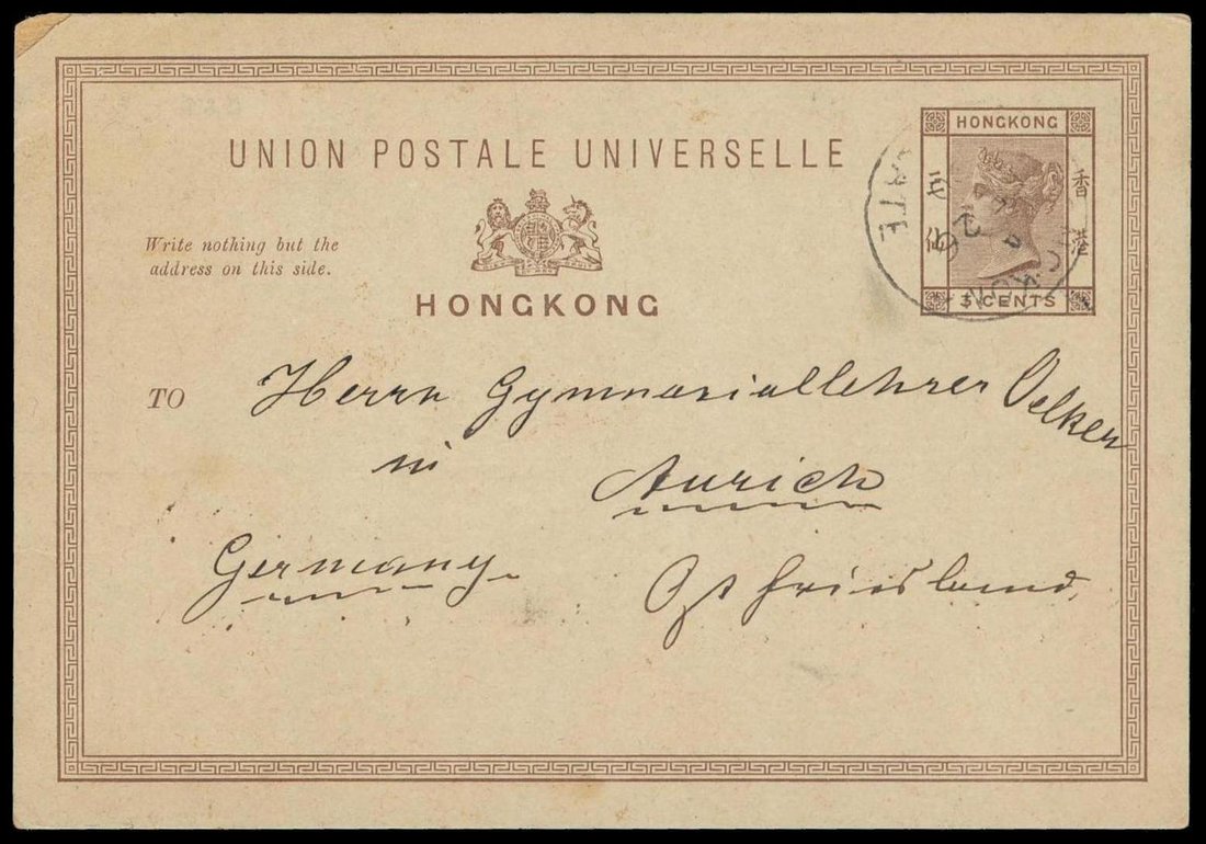 1890 (26 Feb.) 3c. stationery card to Germany cancelled by a fair strike of the "HONG KONG/TOO LATE" c.d.s. code "A". Fine and good usage. Photo