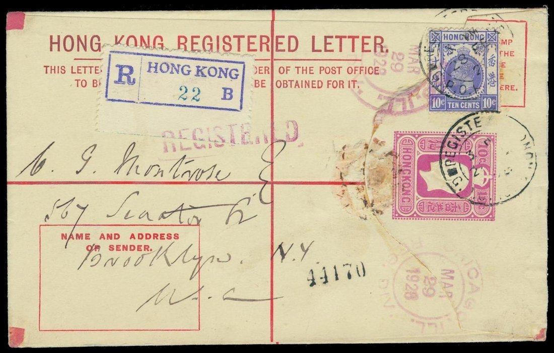 1928 (28 Feb.) K.G.V 10c. registered stationery envelope ,size G, to Brooklyn (31.3) bearing K.G.V 10c., cancelled by "Registered/G.P.O. Hong Kong" c.d.s. with registration label alongside, fine and clean with nice $10 single franking. Photo