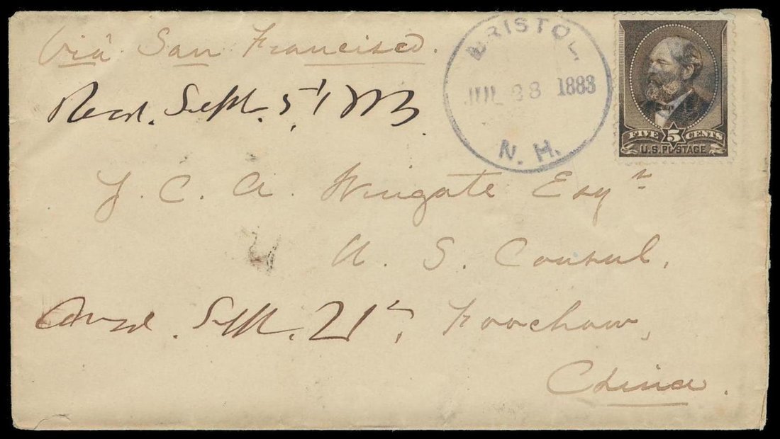 Incoming Mail: 1883 (28 July) envelope from Bristol, New Hampshire to Foochow "Via San Francisco" bearing 1882 Garfield 5c., the reverse with San Francisco, Hong Kong and Foochowfoo (5.9) c.d.s. Photo