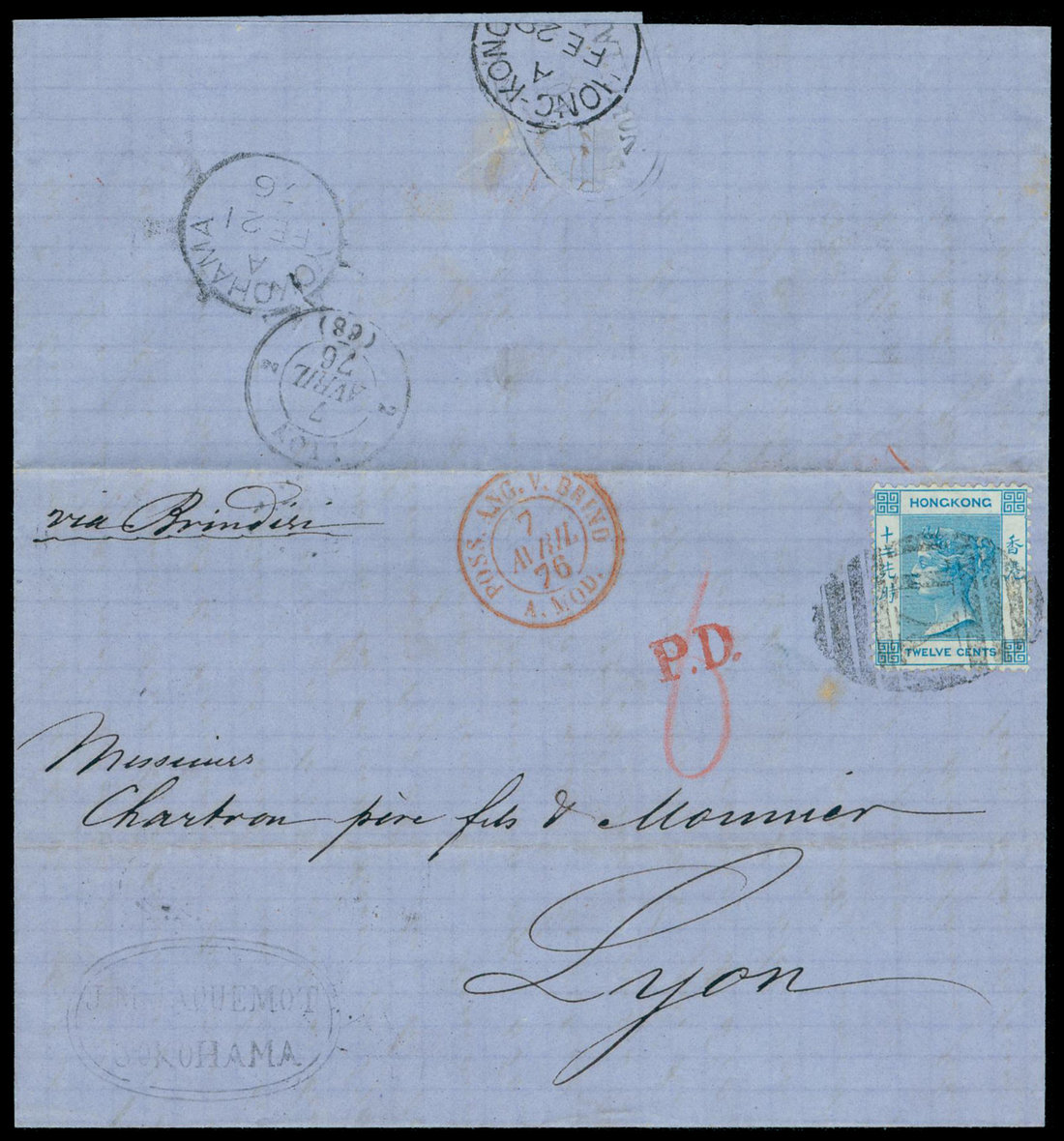 1876 (21 Feb.) "Via Brindisi" entire to France (7.4 Lyon arrival) bearing 12c. pale greenish blue, tied by very fine "Y1" in blue with "P.D." unframed h.s. in red alongside, with matching blue "Yokohama/A" and "Hong Kong/A" (28.2) c.d.s. on reverse, fine and appealing. Photo