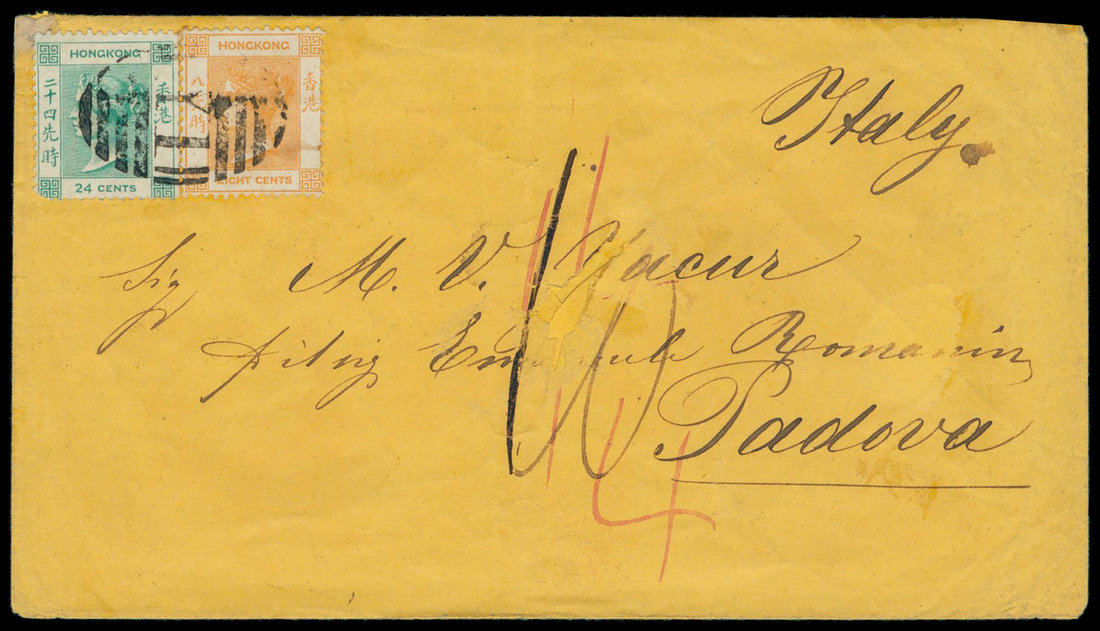 1869 (4 Sep.) envelope to Italy (28.10 Padova arrival in red) via Hong Kong, Alexandria and Brindisi bearing 1865 8c. pale dul orange and 24c. green, tied by very fine "Y1" in black, with matching "Yokohama/A" and "Hong Kong/C" (12.9) c.d.s. on reverse, a little roughly opened on reverse, fine and attractive. Photo