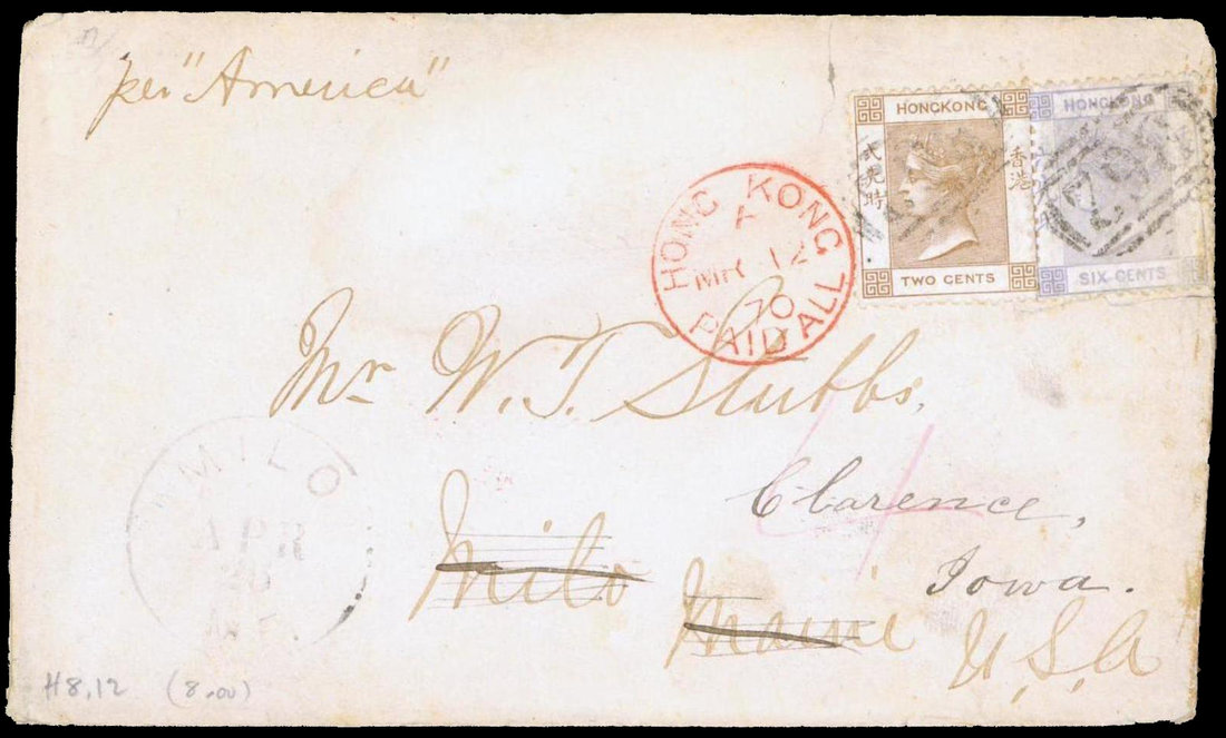 1870 (12 Mar.) envelope to U.S.A. "per 'America'"bearing 2c. and 6c. cancelled by "B62" with "hong kong/paid all" code "A" c.d.s. in red alongside, light San Francisco transit c.d.s. (14.4) on the reverse and faint Milo c.d.s.; some soiling, the 6c. with small defects and the cover is torn below this. A good franking. Photo