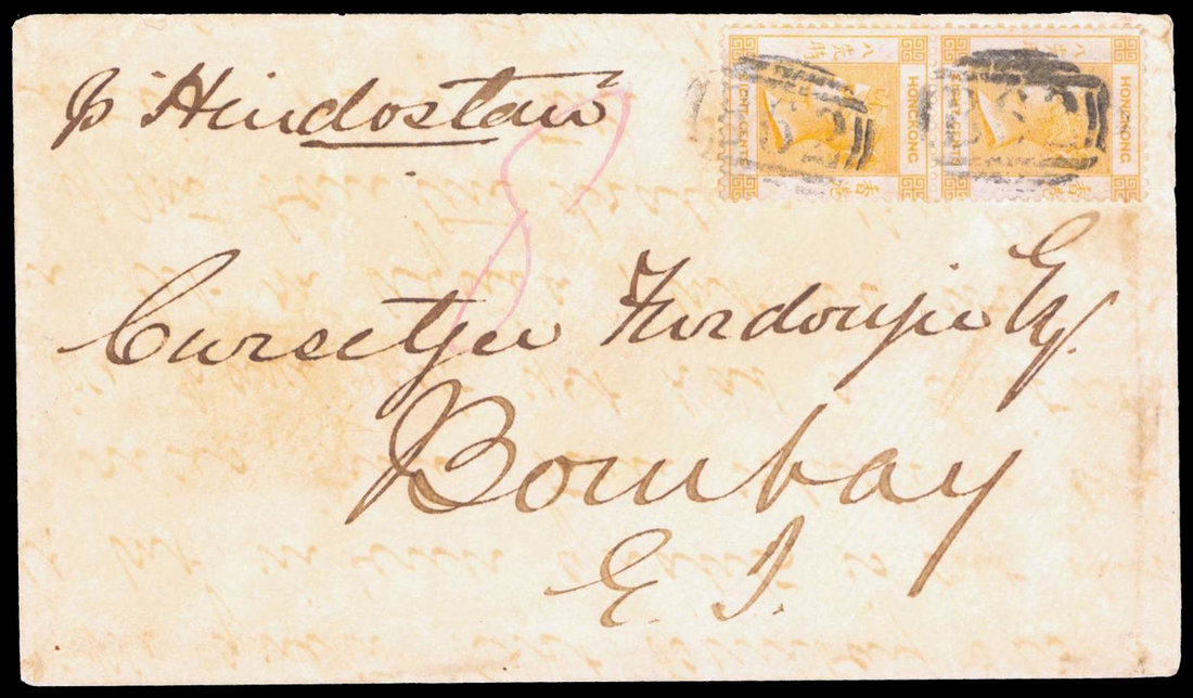 1870 (21 July) envelope to Bombay "pr 'Hindostan'" bearing a vertical pair of 8c. tied by "B62" and with "8" rate mark in red ink, the reverse with Hong Kong despatch c.d.s. code "C" and two different Bombay arrival c.d.s. (13.8). Fresh for an Indian cover. Photo
