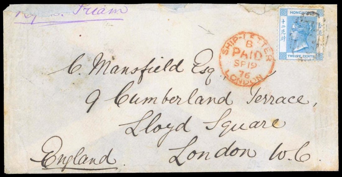 1876 (21 July) envelope to London bearing 12c. pale blue tied by "B62" with a very good strike of "ship-letter/london" Paid c.d.s. (19.9) in red alongside; the reverse bearing Hong Kong c.d.s. overstruck by London arrival. The envelope is slightly reduced at top and with some creasing and wrinkling. The date on the reverse is unclear, but an interesting cover apparently paying the 12c. rate by U.S. packet which was introduced on 2nd September 1876. Photo