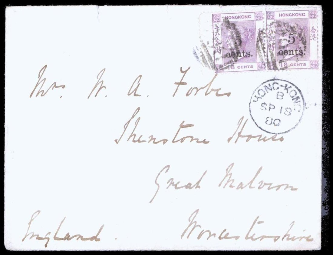 1880 (18 Sept.) envelope to Great Malvern, England beaing horizontal, wing margin pair of 5c. on 18c. (a couple of small bends or creases on the right stamp) tied by "B62" with a fine strike of Hong Kong code "B" c.d.s. below with Malvern arrival on the reverse. A little roughly opened at top but still fresh and fine. A very appealing cover. Ex Milo Rowell. Photo