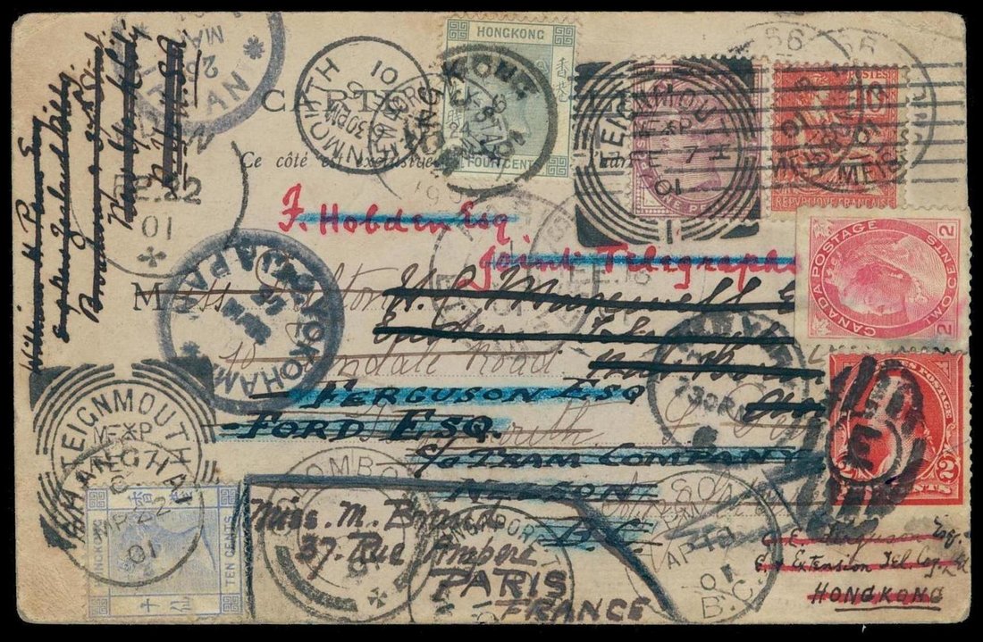 1901 "Round the World" card bearing adhesives of France, G.B., Hong Kong, Canada and U.S.A., cancelled by an array of transit c.d.s. including Colombo, Shanghai and Yokohama, also bearing two strikes of "SINGAPORE TO HONG KONG" type 4 marine sorter (one each side) code "C". Typical soiling but full of character. Photo