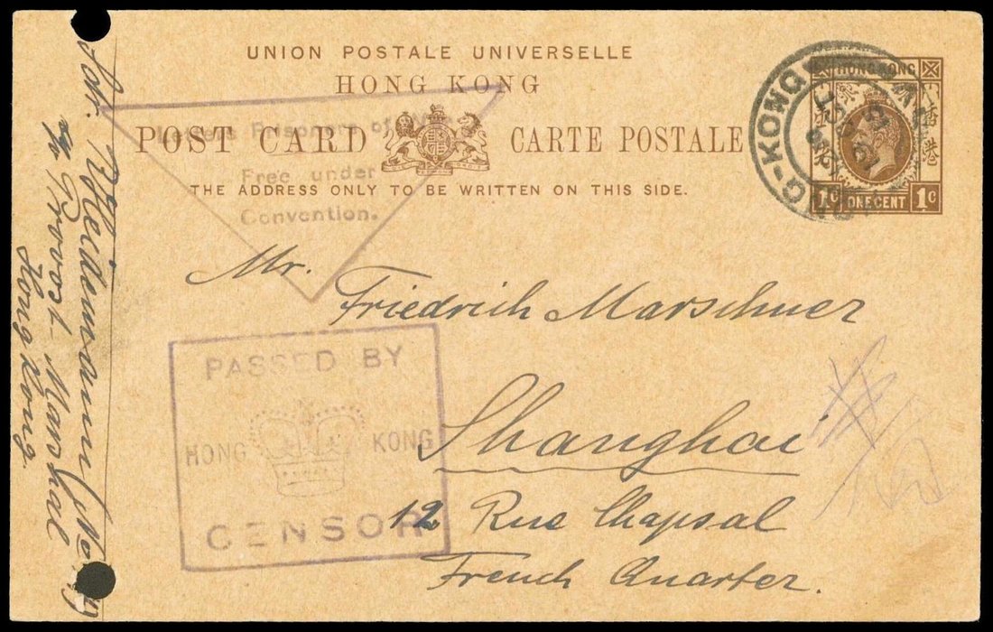1915 (19 Oct.) 1c. postal stationery card to Shanghai from a German prisoner of war and bears good strikes of "passed by/hong Crown kong/censor" boxed handstamp and triangular "Letters Prisoners of War/Free under/Convention." both in blackish purple; two punch holes at left. Scarce markings. Photo