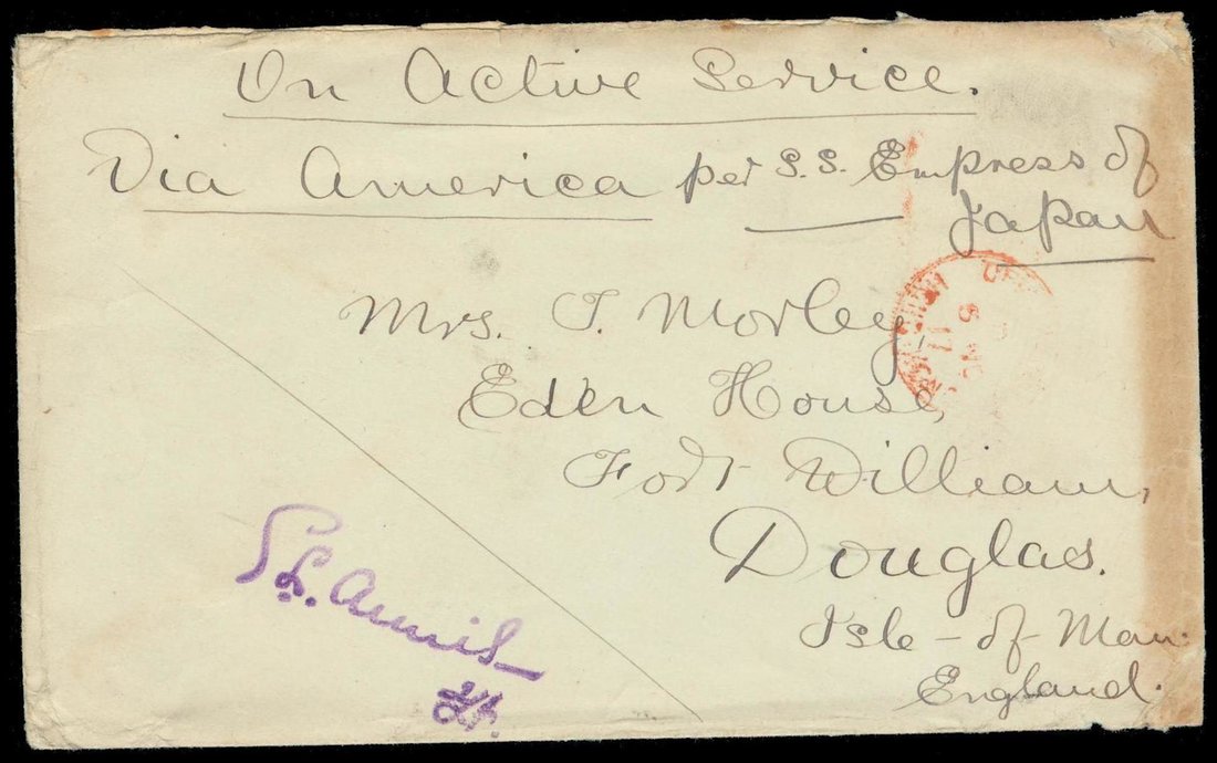 1917 (5 Nov.) "On Active Service" stampless envelope to the Isle of Man, countersigned by the commanding officer (handstamp) and bearing a fair strike of the Official Paid c.d.s. in red; age mark at right. A good military cover. Photo