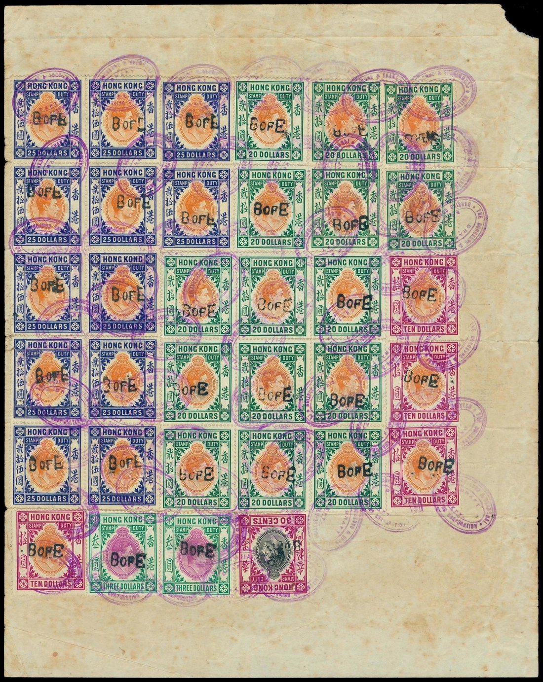1950 (18 Mar.) A document issued by HSBC regarding the telegraphic transfer of 200,000 Sterling (equivalent to $3 million Hong Kong dollar plus) to Chase Bank, Hong Kong, with the cost of stamp duty of $646.3, bearing on reverse K.G.VI. Stamp Duty 30c. single, $3 (2), $10(4), $20 (15), $25 (12), all with "B of E" overprint in black and tied by "The Hongkong & Shanghai Banking Corporation/Draft Dept." oval h.s. in violet; unusal for such high amount transferred in during 1950s. Photo