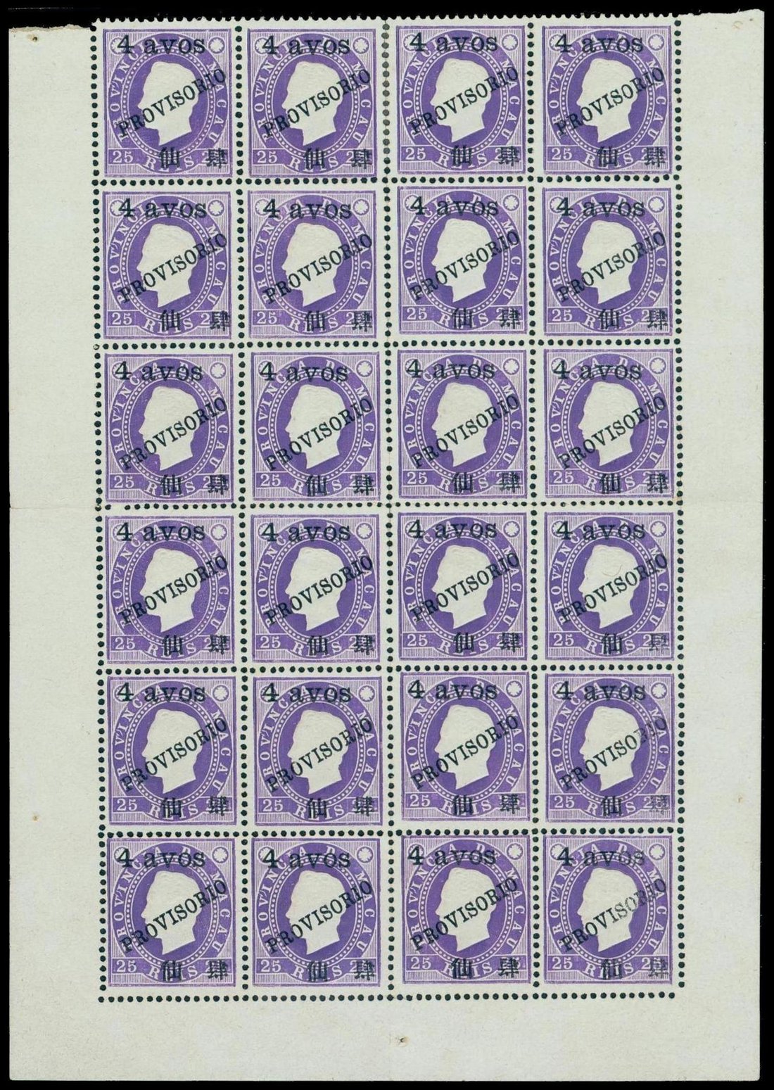 1894 New Currency; 4a. on 25r. violet in a part sheet of twenty four, without gum as issued, a few reinforced perfs at top and some ageing on the reverse. S.G. 77, £672. Photo