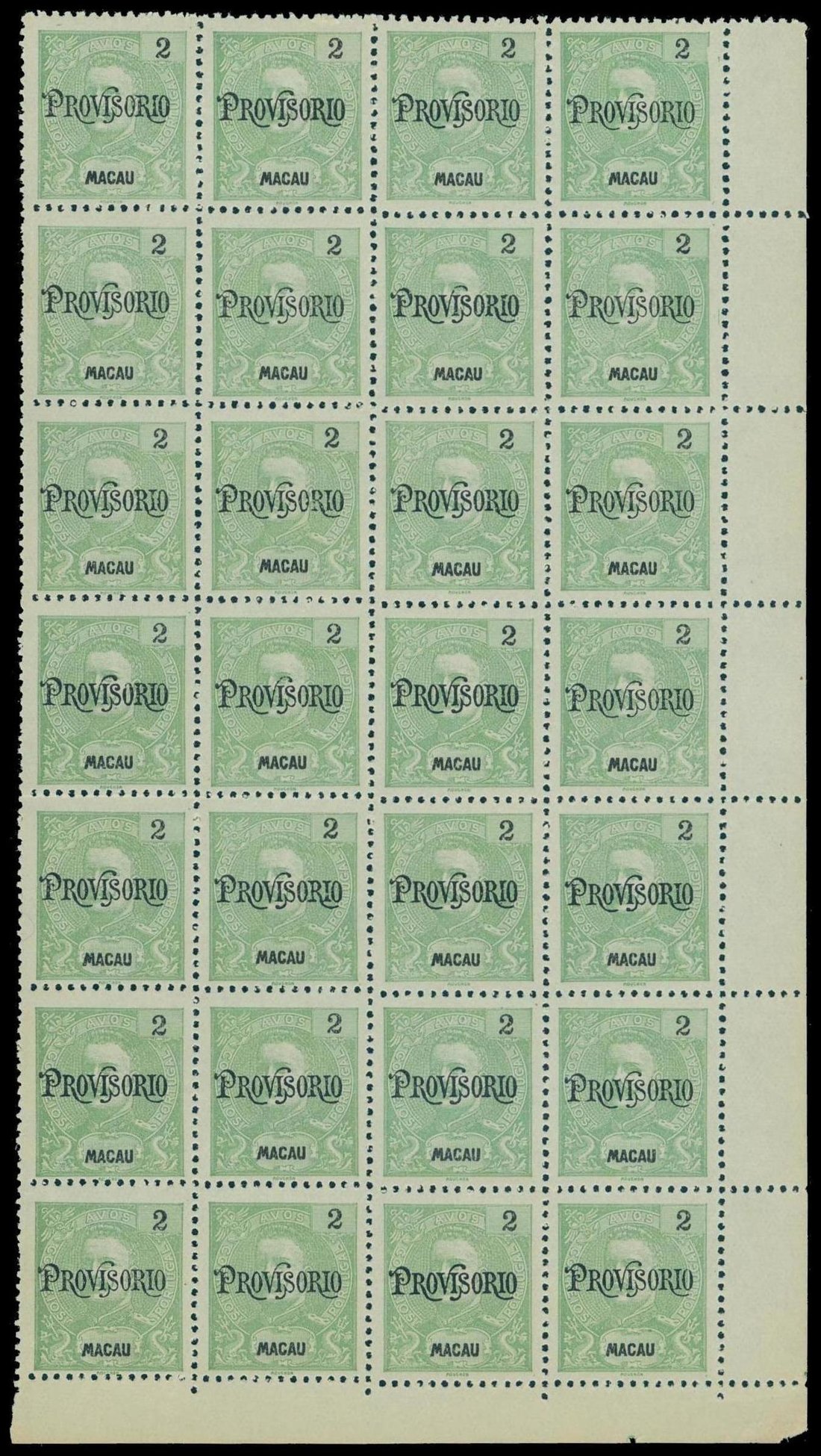 1902 "Provisorio" overprint on 2a. pale green, in a corner block of twenty eight, without gum as issued. S.G. 168, £500. Photo