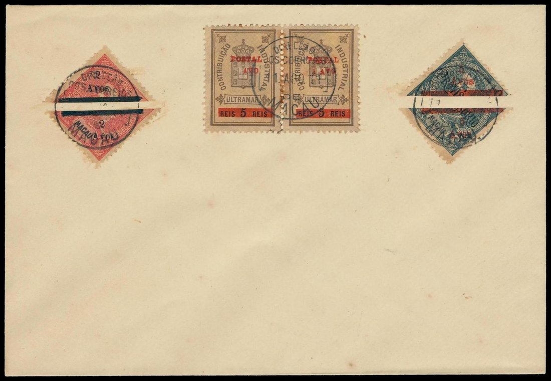 1911 (11 Aug.) neat and unaddressed envelope bearing "Postal Avo" surch. on fiscals 1s. on 5r. horizontal pair (left stamp "1" missing), D. Carlos I bisected digonally 2a. on 4a. and 5a. on 10a., cancelled by c.d.s., fine. Photo
